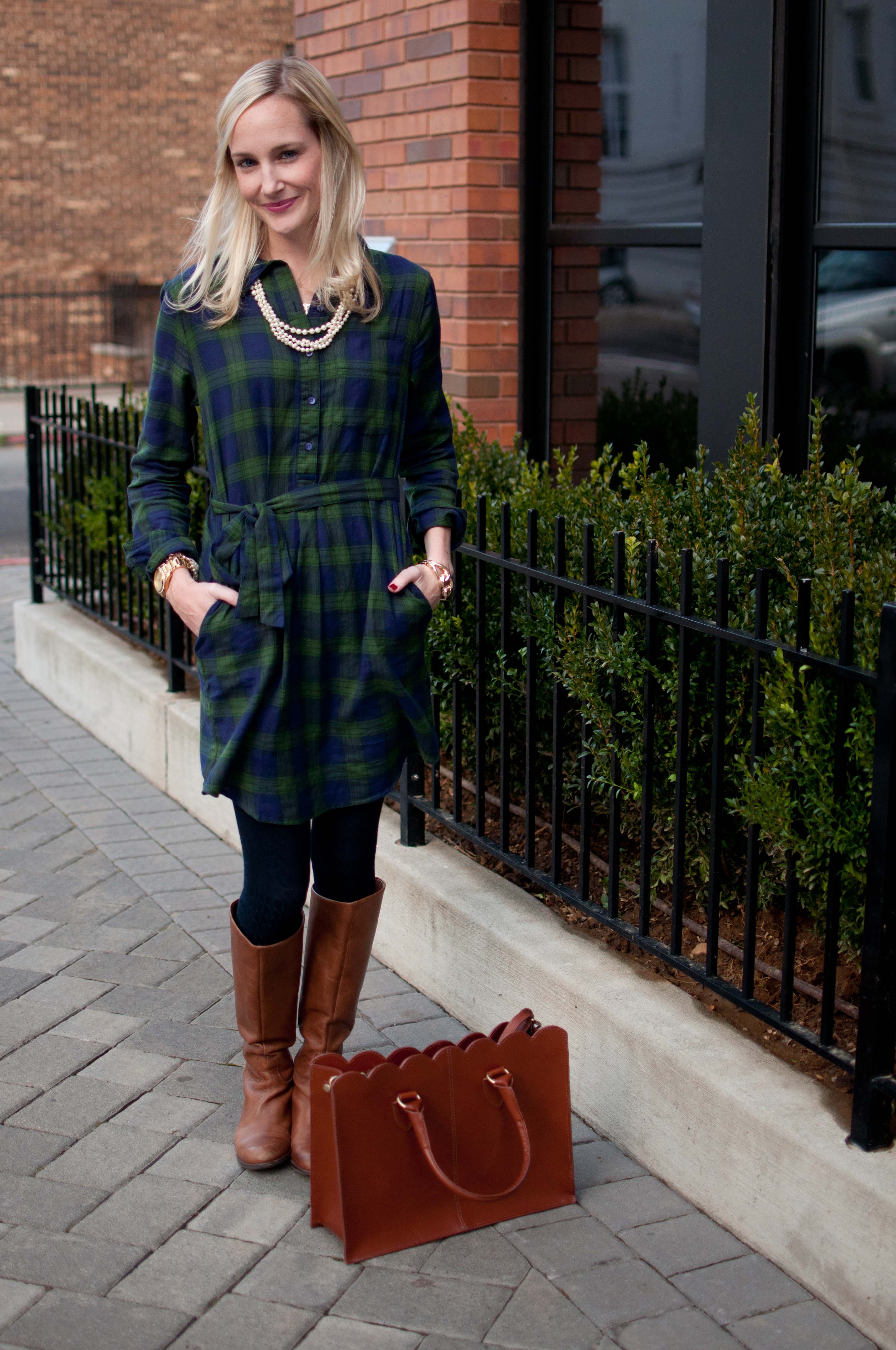 Layered over a blouse or turtleneck, via A Southern Drawl. A plaid shift like this can easily be worn both over and under other clothing items to give the same dress very different looks. Love how this was layered over a turtleneck and paired with a great pair of over-the-knee boots.