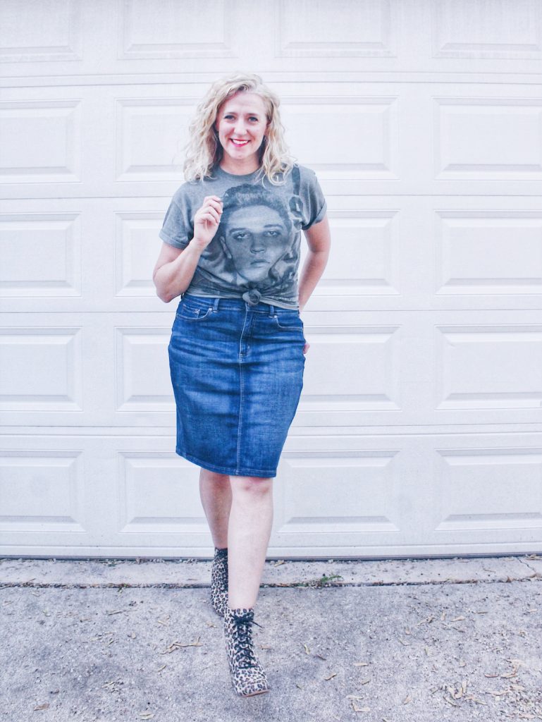 You can wear this look in a number of different ways. Tuck the t-shirt into your skirt. Give it a little Tan-approved French tuck. Knot the shirt on the side or in the front. Allow the shirt to lay as it usually would over the skirt. Find the look that works best for you and for the shape of the shirt. Plus, this style, as you can see below, can be worn with wedges, booties and sneakers.