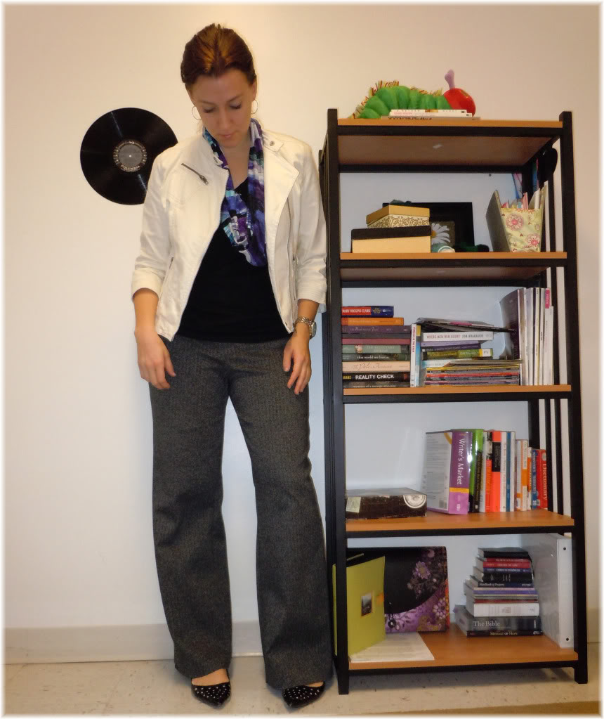 This off-white motorcycle jacket is perfect in a number of ways… It has interesting lines with the zippers and pockets. It is a cropped jacket which works well with my short torso and long legs. It has no collar - which I oddly enough like a lot.
