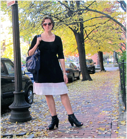 First up… the little black dress with the cream and pink hem. I’ve actually managed to scare to LBDs from swaps over the last year. Not bad, huh? This one is great because it has the colored hem, which adds a little something to an everyday LBD. Plus it feels great on and it actually long enough for my legs! (Check out other ways I’ve worn this dress: With a pink scarf or with my white motorcycle jacket.)