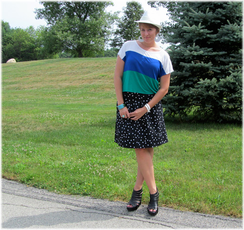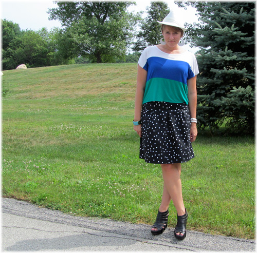 There are days when I feel the need to stick with the tried and true outfit combinations. And then there are days when I want to try something different, or at least different for me. This outfit is one such moment. I knew I wanted to wear the polka dot skirt for a presentation I was giving on social media to a group of high school students. The rest… well, I just wasn’t sure. I tried on a number of different tops and didn’t like the looks of any of them. In despair I slipped on this shirt with the plan to change skirts but then I liked the large color-blocked shirt paired with the polka dot skirt and an outfit was born. The accessories fell into place and I went with the chunky gladiator-styled wedges to add a little edge to the skirt.