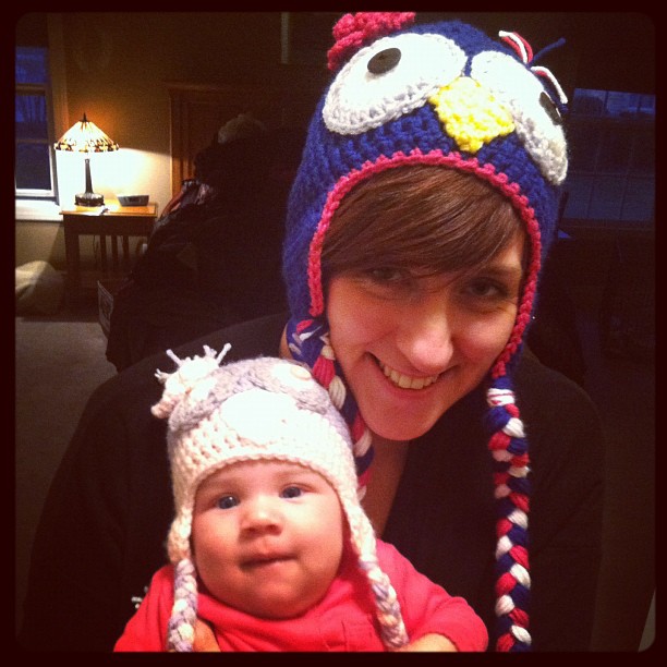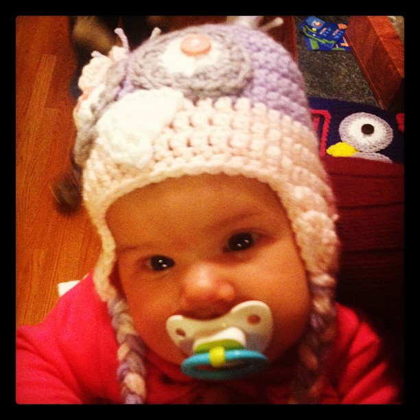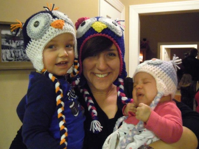 And she can do more than just these adorable owls. Dogs, teddy bears, etc… She can also work with colors that will match winter coats or the kids favorite shades. For my newphew, who is almost two, she went with Chicago Bears colors. For my two-month old niece she made a very girly hat with light pink, purple and gray.