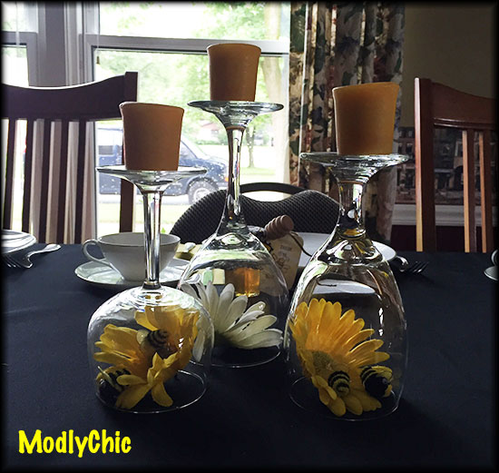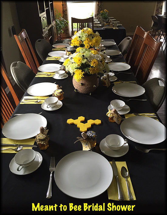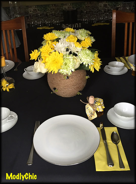 The tables were decorated with bee-hive looking floral arrangements as well as upside down wine glasses with flowers and bees under the glass. We used black table cloths and yellow napkins, and, of course, the fine china.