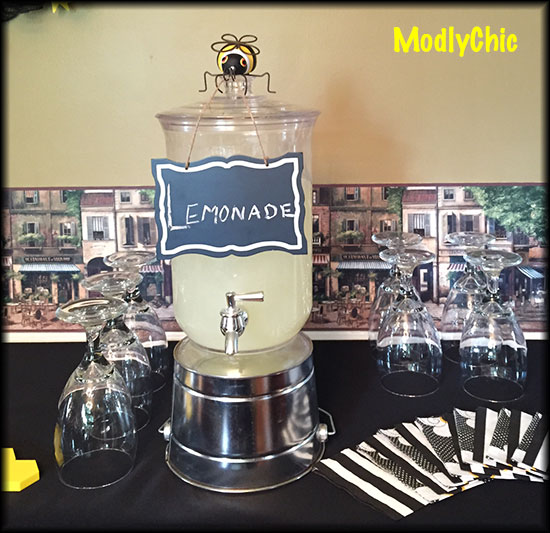 To work the Bee theme we went ahead and made everything yellow and black, even the hostesses for the day donned yellow and black clothing. Mom made large wreaths using wire-lined ribbons in, of course, yellow and black, as well as white and tan. Want to learn how to make your own? This is the video she used to get inspired.