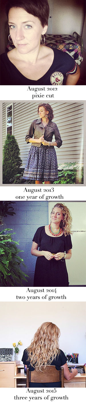 Now my hair is long and curly, but it wasn’t even four years ago that I had a super short pixie cut. If you are a long time reader, you might remember that short-hair phase that lasted nearly 5 years. Often in the midst of that super short-haired phase I would decide it was time to grow it out. That would last 6 months, or maybe even 9 months, and then I would grow tired of the growing out process and chop it all off again. Finally I decided, enough was enough and so when I moved back to the Midwest from Boston I decided it was time to take growing my hair out seriously.