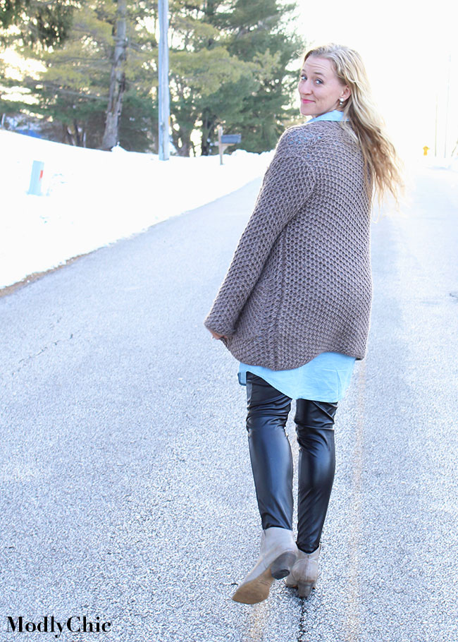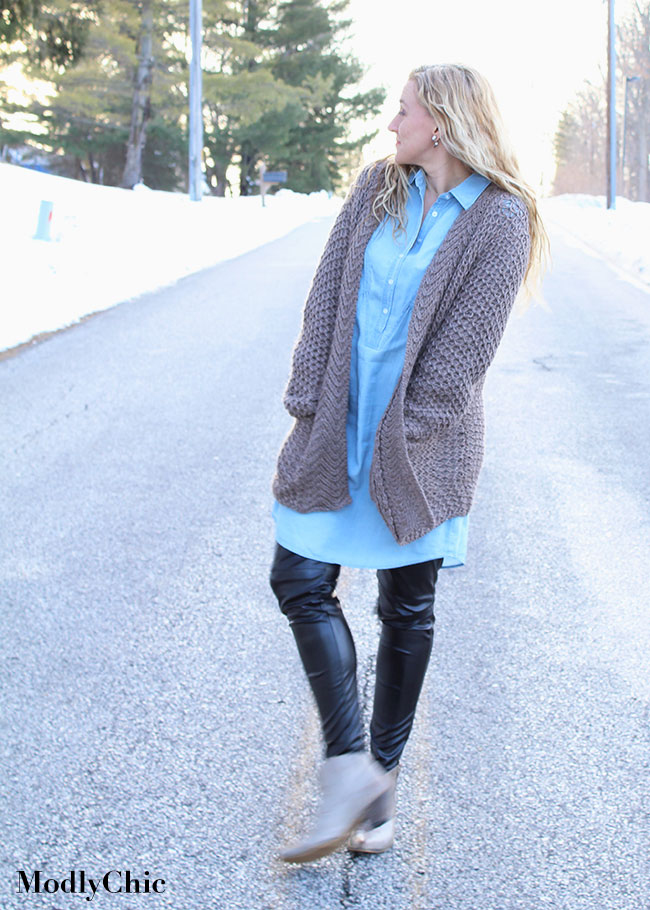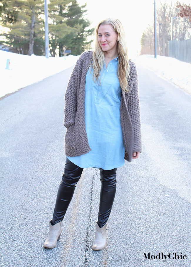 If you haven’t noticed yet, denim and chambray dresses are making a comeback in a really big way this Spring! So I snagged this perfect chambray dress from Burlington. While the sleeves are long, the material is still too thin to wear alone right now. The dress, at this stage of the year, needs add-ons, so I grabbed the leopard-print scarf, which can carry me through all 4 seasons; the vegan leather leggings, which are a perfect addition for the cold months; as well as the oversized cable-knit sweater. (The chambray shirt dress sells for $29.99)