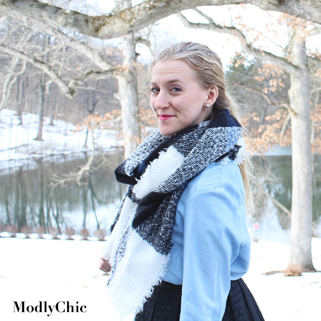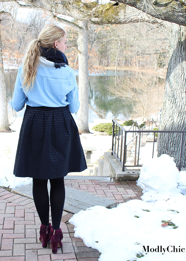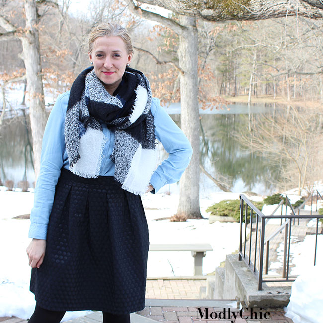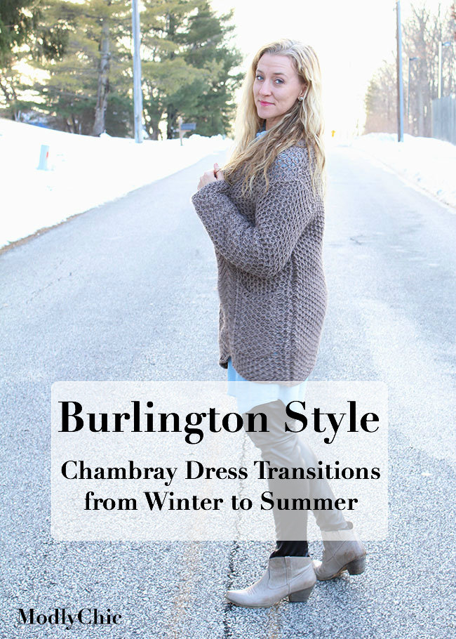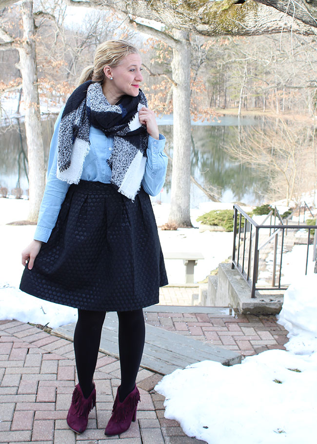 Then I got to mixing and matching with the items I got from Burlington as well as the things I already have in my closet. The black skirt and blanket scarf have been a wardrobe staple this winter, and they work really well layered over the dress. I actually wore the layered sweater look and then the skirt/scarf look on consecutive days and no one noticed I was using the chambray dress twice on the same weekend.