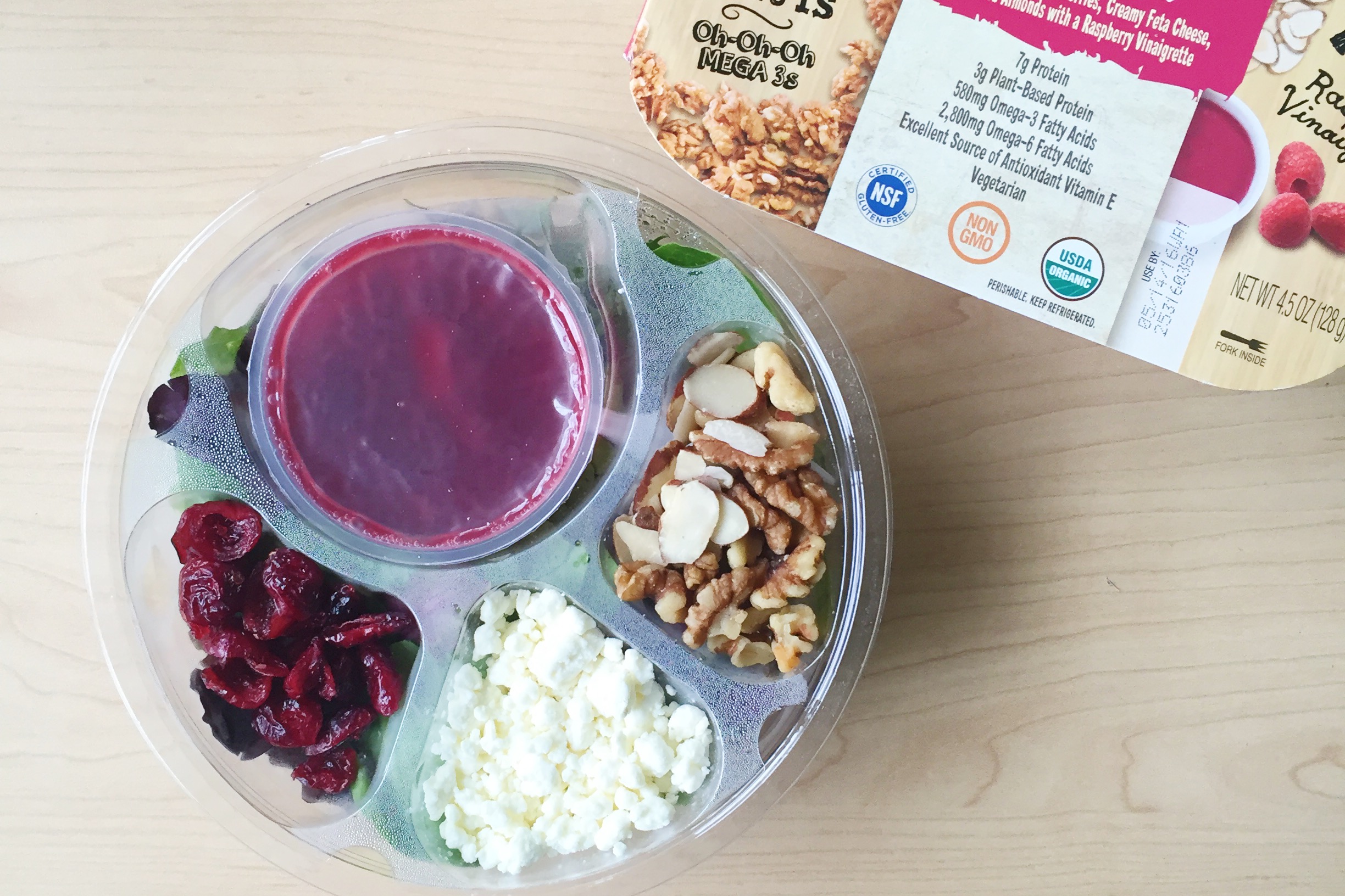 The fact that these salads come perfectly packed, and easy to assemble are all major selling points in my opinion. The bowl is filled with the lettuce or spinach mix. On top of that in a little plastic plate are separated out the remaining ingredients. Don’t like something? You don’t need to mix it in. Want a little less dressing - that totally up to you too.