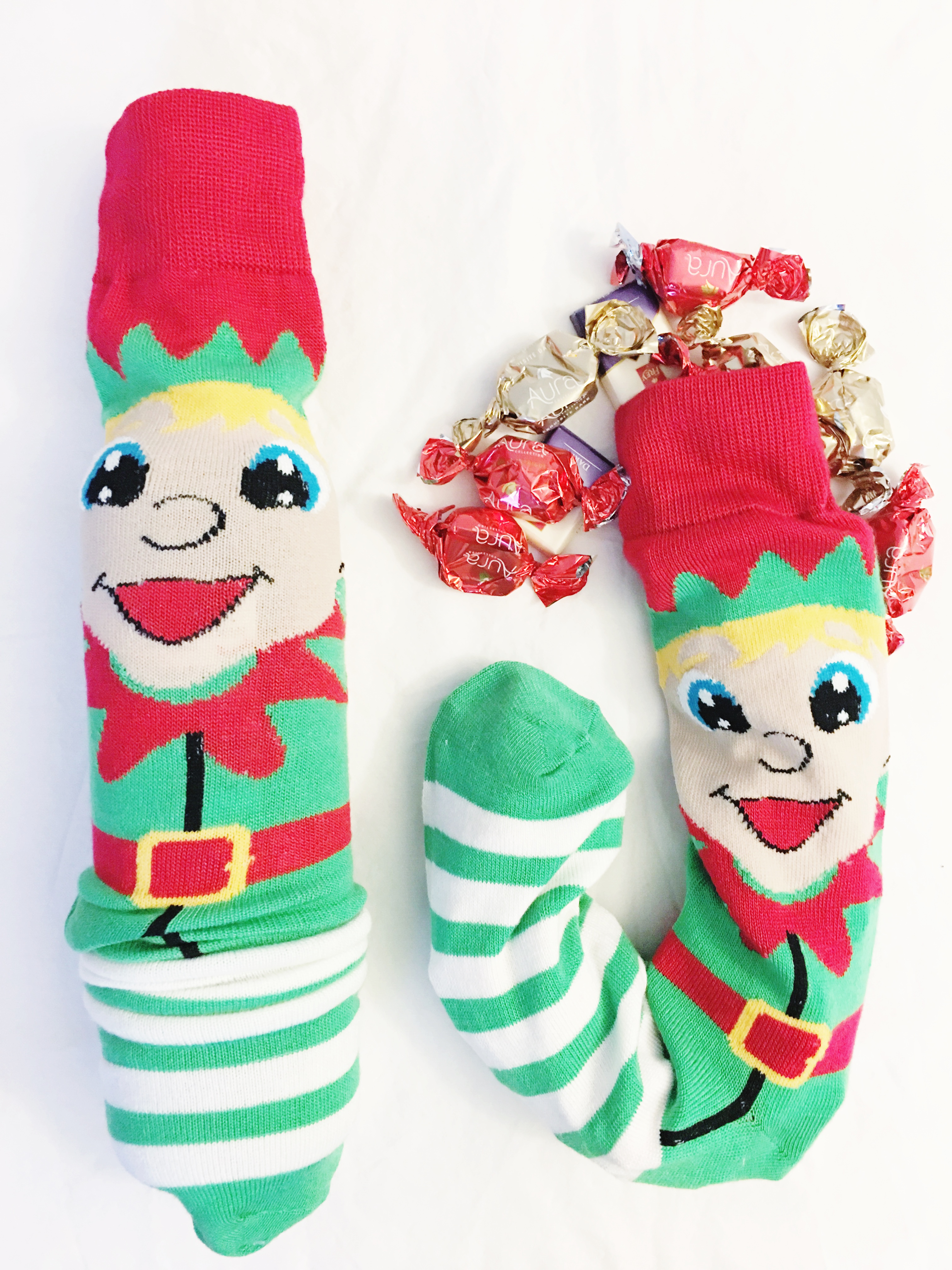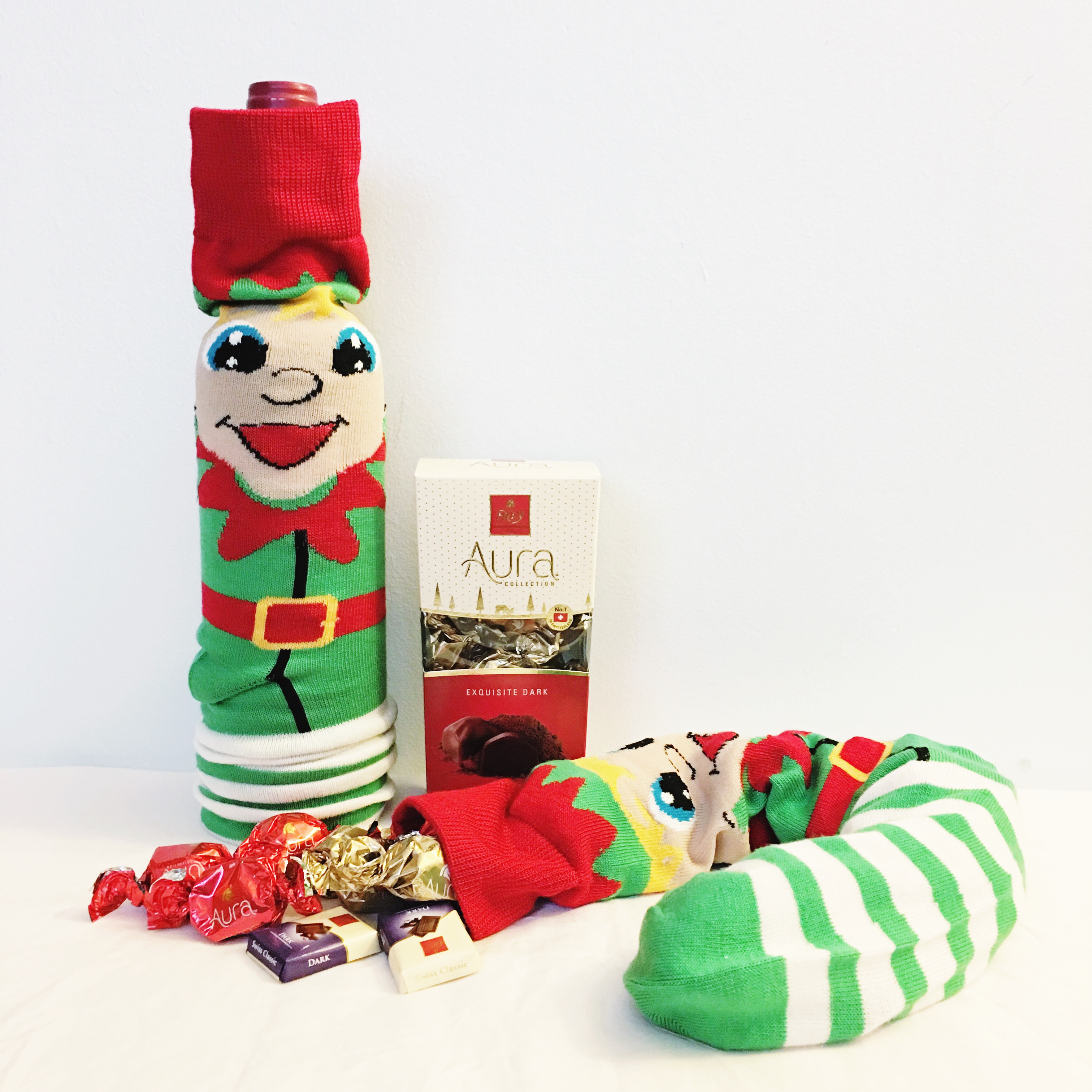 4. Hostess - This year, I will be bringing a bottle of wine and a collection of candy to every party hostess. Instead of wrapping it in the usual gift bag, or bringing it as is, I’m adding an element of interest by purchasing festive socks. One sock will be filled with chocolates and one will be filled with a bottle of red wine. Cute, simple, thoughtful, and still easy.