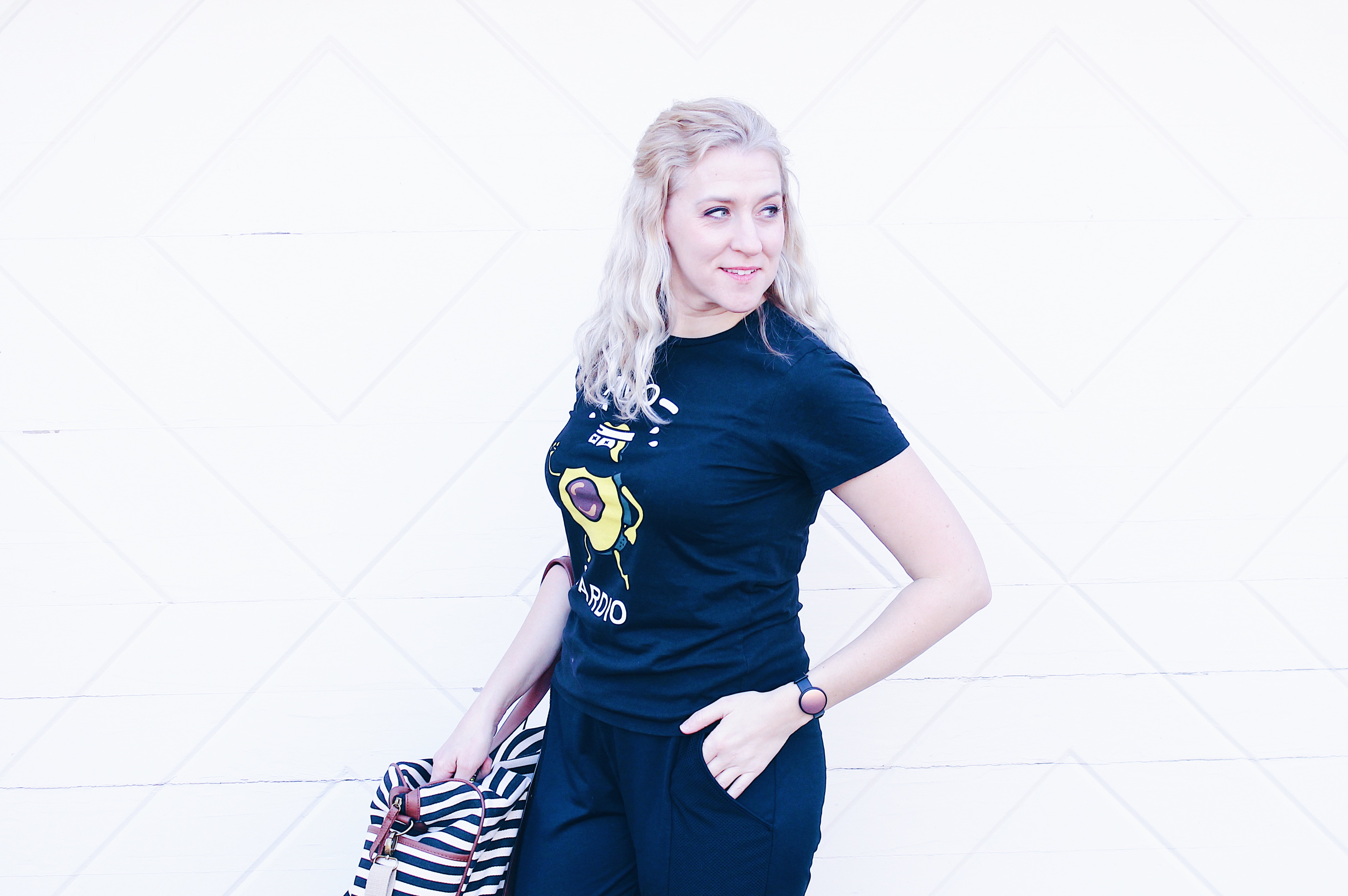 (In case you were wondering… Avo-Cardio tee from Amazon. Joggers from Fabletics. Gym Shoes from Asics. Gym Bag from Kelly and Katie.)