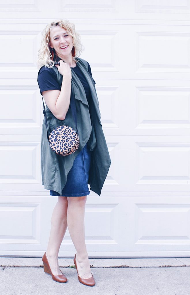 Similar to the kimono look, a vest can add an interesting element to the standard skirt and t-shirt look. This long green vest is one of my favorites, so you will often see me pairing it with a number of things in my closet. If a long vest is not your style, you can also go with a traditional vest. At times I’ll pair this with a denim vest in a lighter color.