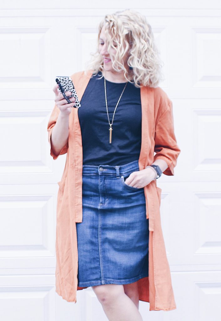 I’m a sucker for a kimono during the summer months. They add an interesting eye-catching element to your look, usually without adding a heat-inducing layer. Plus, depending on the kimono, it can really dress up the denim skirt, like this look with the more structured orange kimono. I’m also repeated this look with a patterned kimono, as well as kimonos that were longer and shorter.