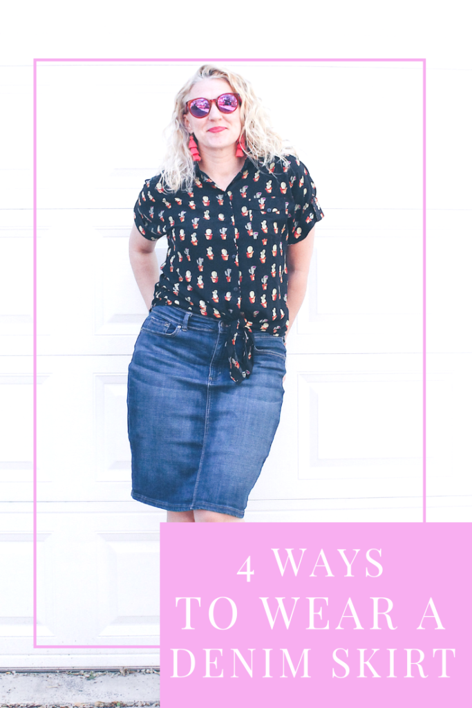 For a more dressed up look - perhaps something you could get away with on a casual Friday in the office, try pairing a blouse with your denim skirt. Since these tend to be a little shapeless, I like to either partially tuck the blouse in (again with the French tuck) or knot the ends together to cinch the waist. Since the denim skirt is basically a solid, you can be bold with the colors or patterns of your blouse.